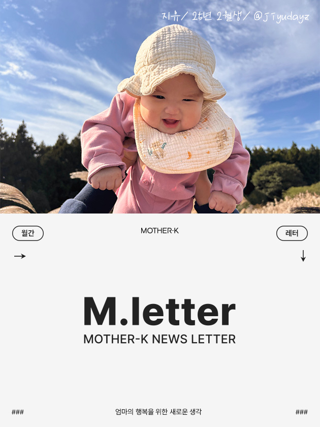 앞으로 M레터의 표지를 우리 아이들의 사진으로 채워보려고 해요. 이번엔 마더케이 인스타그램을 통해서 약 일주일 기간을 두고 모집을 했는데도 지원해주신 분들이 꽤 많았어요. 치열한 경쟁을 뚫고 첫 가을을 맞이한 지유의 사진이 11월 표지를 장식했어요🤎 너무 귀엽고 사랑스럽죠? 독자님의 사진첩 속 우리 아이의 귀엽고 특별한 사진, 지금 M레터에 보내주세요.