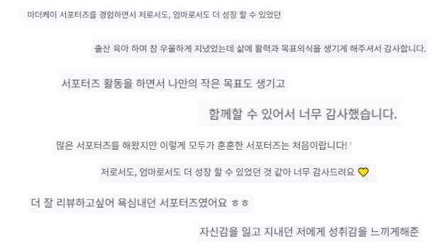그래서 마더케이가 서포터즈 활동을 통해 바라는 건, 단순한 제품 홍보가 아닌 잃어버린 소속감을 찾고 육아로 잠시 잊었던 또는 포기했던 성취감을 되찾는 시간을 갖는 것이에요. 감사하게도 이번 9기 슈퍼마더케이 분들께 이 마음이 잘 닿았던 것 같아요. 받은 소감에 ‘잘 해보고 싶은 의지’, ‘작은 목표’ 같은 단어들이 참 많이 보였거든요 |