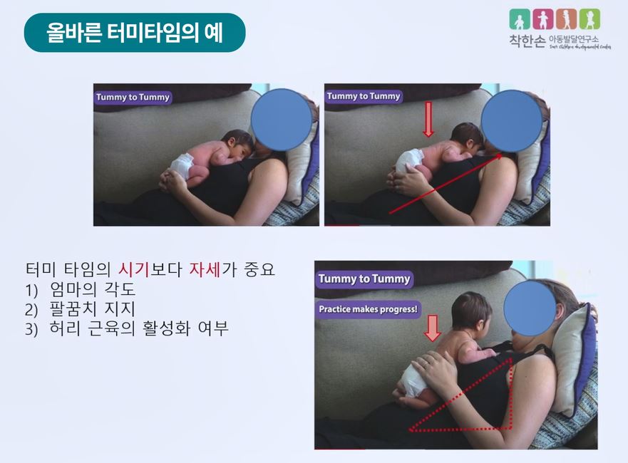 가장 처음 엄마의 가슴 위에서 터미타임을 할 때는, 엄마가 소파에 기대 누워서 경사 진 각도를 유지하는 것이 좋아요. 완전히 누운 상태보다 살짝 세워진 상태에서 아이도 터미타임을 쉽게 할 수 있어요. 아이의 팔꿈치는 너무 벌어지지 않게 모아서 지지가 잘 될 수 있도록 해주고 아이 허리에 손을 대고 허리 근육이 잘 활성화 되고 있는지를 확인해주세요.